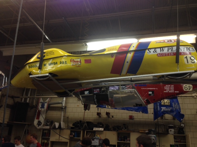 When you walk into the room, the sights match the sounds and smells. Supermileage cars from years past hang from the ceiling. Small engines and their various parts lay across tables. A student, clad in a protective plastic suit, spray paints a car while other students bustle about working on their own mini-vehicles.