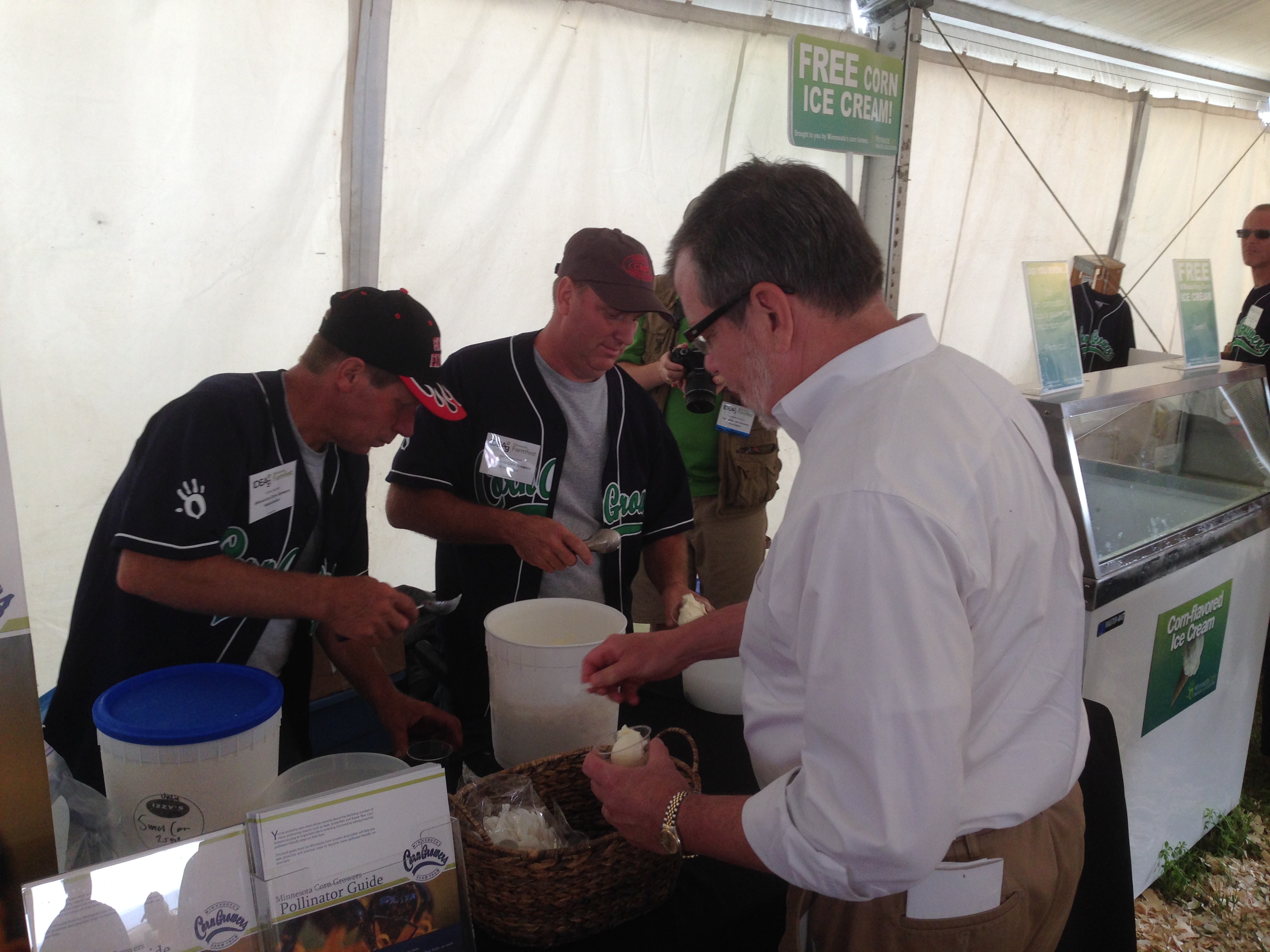 U.S. Congressman Tim Walz (right, wearing hat) was one of many elected officials and candidates for office to visit the MCGA tent. A few congressional and gubernatorial candidates were even put to work scooping sweet corn ice cream.