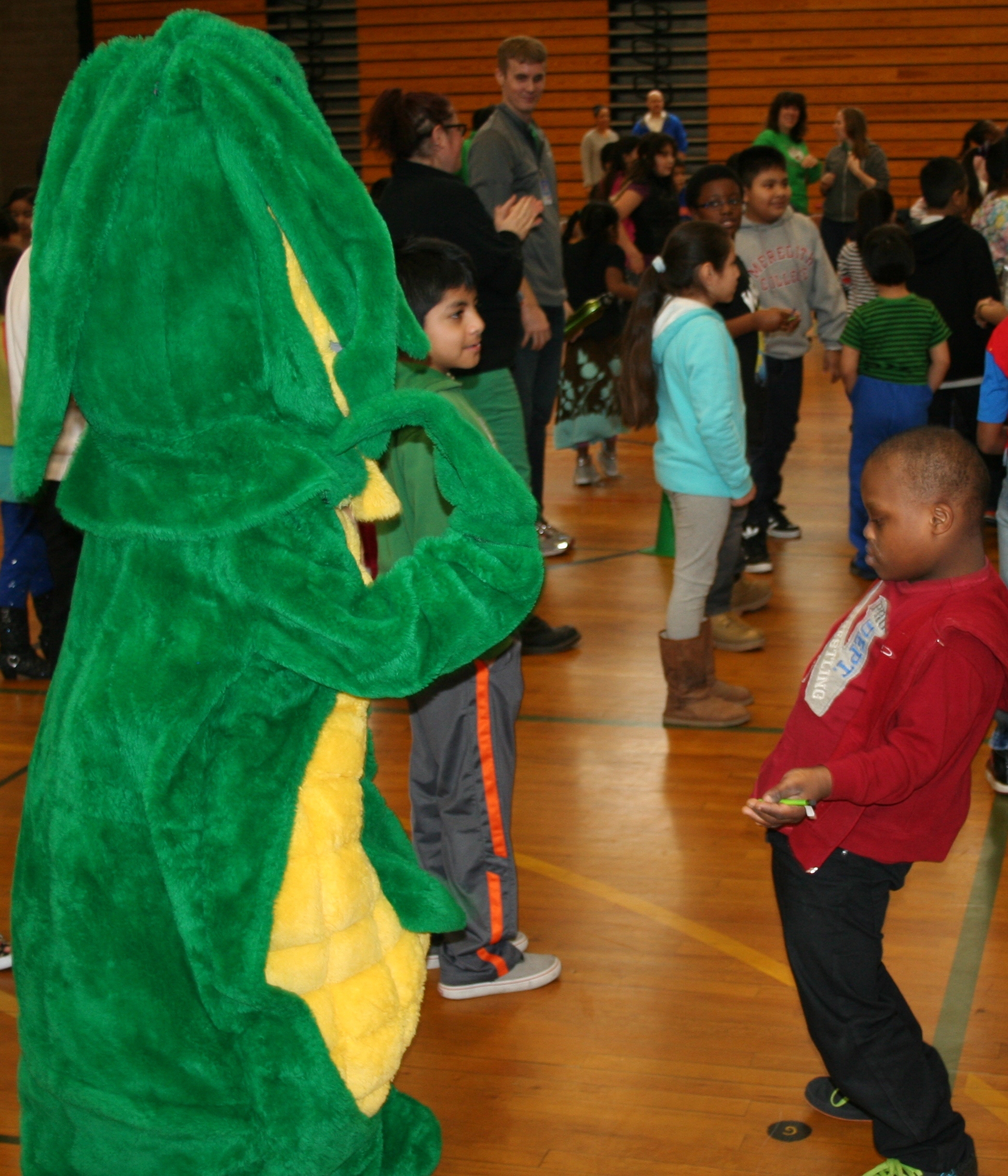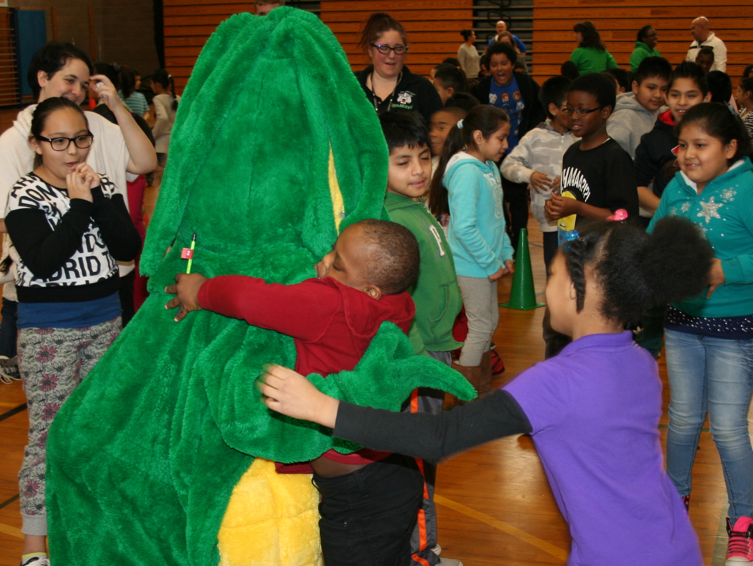 Gettin’ down with Maizey! Each assembly lasts about an hour and includes several opportunities for the kids to dance with Maizey.