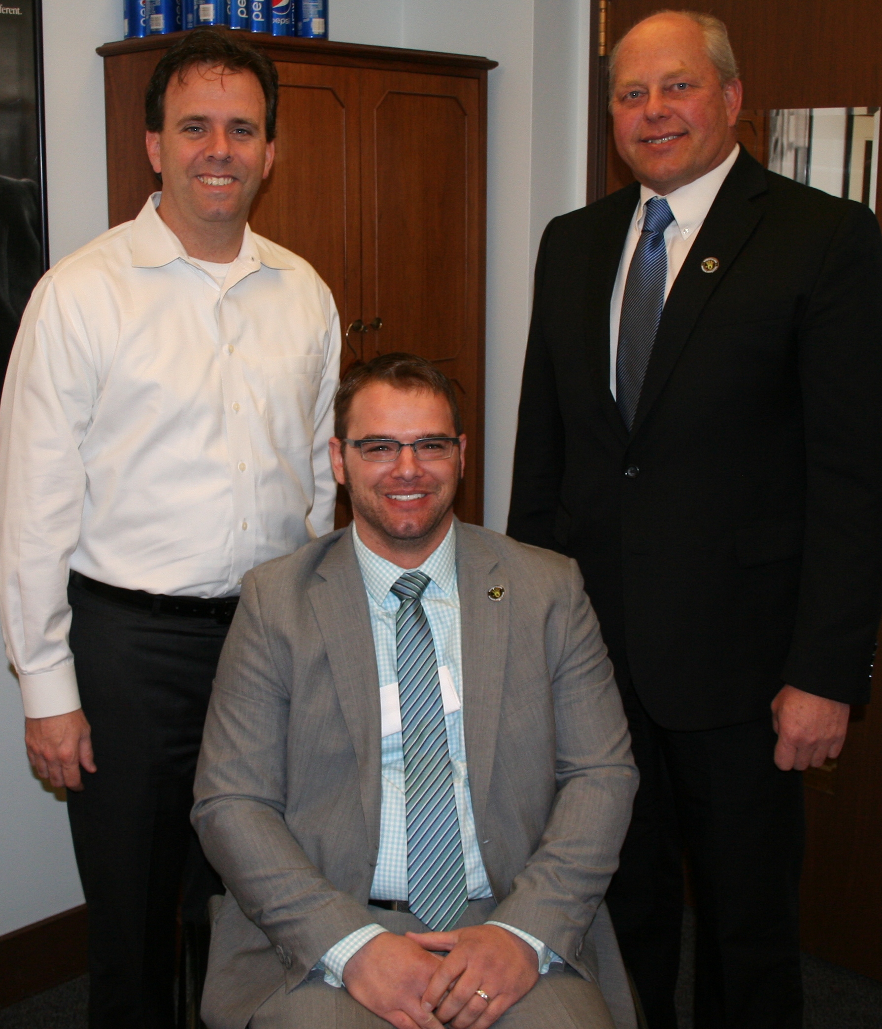 Rep. Pat Garofolo from Farmington meets with Ryan Buck, a farmer near Goodhue and Les Anderson, a farmer near Cannon Falls.