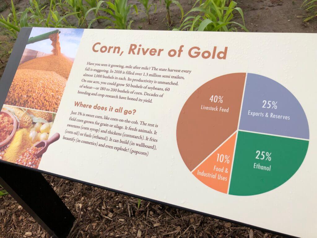 Part of the exhibit, the “Northern Grain Walk” presents the choices crop producers make every time they plant a seed. For example, in one corner by the corn plot a set of bas-relief tablets presents what the different cultivation techniques look like.