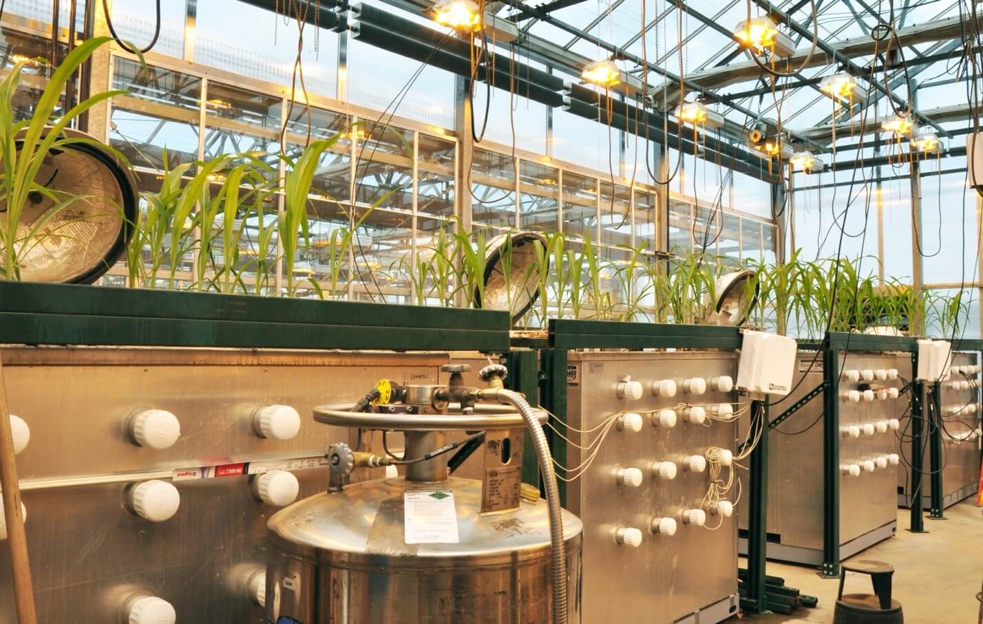 (Mesocosm chambers at the University of Minnesota allow the rapid testing of how corn grows under different climatic conditions)