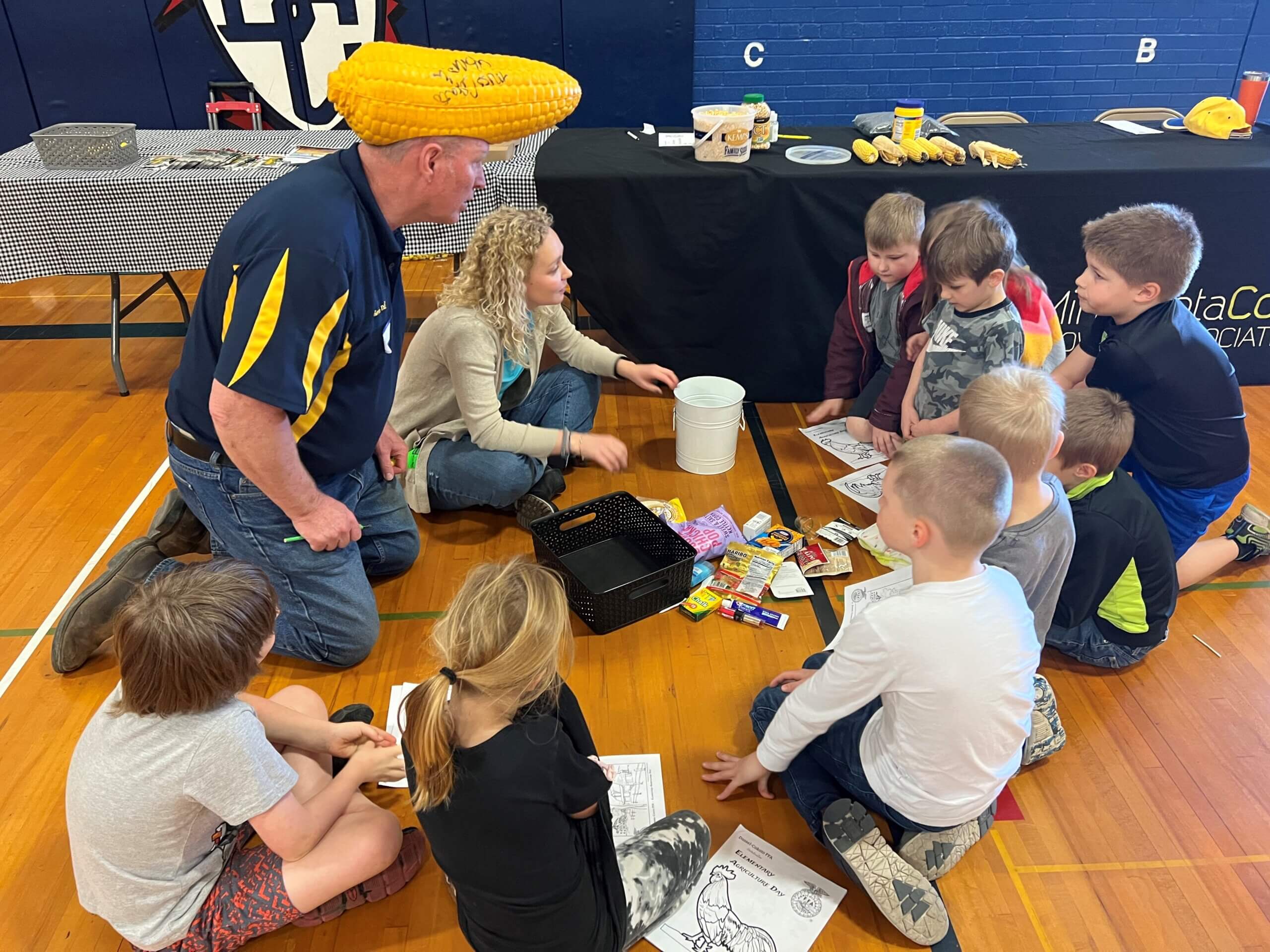It was the calm before the storm and before we knew it, dozens of kindergarteners flooded the gym. My usual target audience is farmers ages 50+, so this was quite the change for me. How we were going to connect with kindergartners through 4th graders (and keep their attention) was the ultimate challenge. I leaned down to their level and started chatting with them about all things corn. Kevin and the FFA volunteers were rockstars and helped facilitate the conversation as well. After a brief introduction to corn, we settled into our short activity with the students.