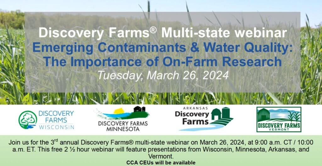 On March 26, 2024 the Discovery Farms® Programs in Wisconsin, Vermont, Arkansas and Minnesota will host a virtual webinar titled “Emerging Contaminants and Water Quality: The Importance of On-Farm Research”. Join this interactive webinar to learn more about farmer-led water quality research in these four states and how the Discovery Farms® network is responding to emerging concerns. This 2 ½ hour webinar will begin at 9:00 am Central Time and 10:00 am Eastern Time. CEUs will be available.