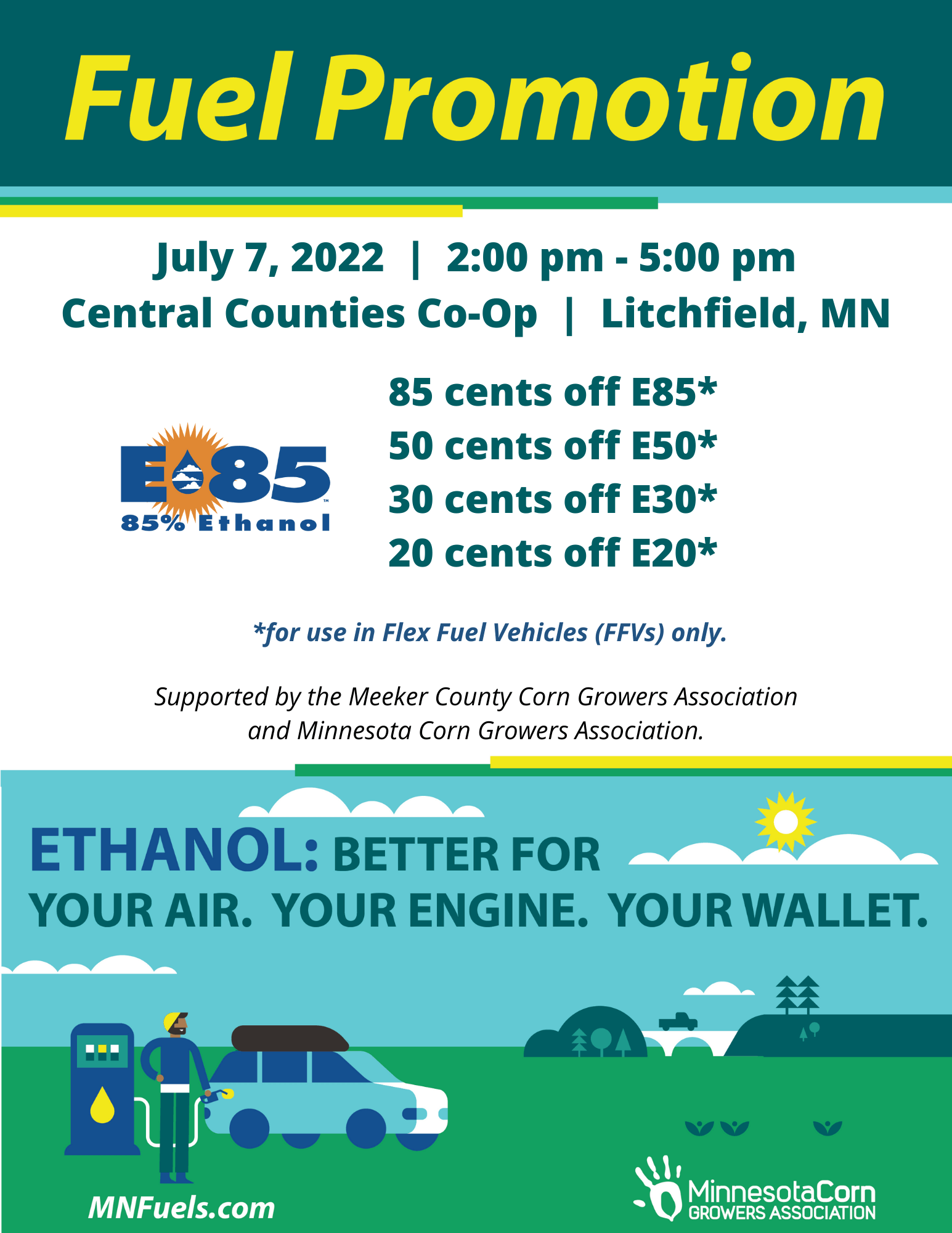 This event has passed. « All Events Meeker County Fuel Event July 7, 2022 @ 2:00 pm - 5:00 pm « Strategic Farming series: Field Notes #9 Meeker County Fuel Event » Add to calendar Google Calendar iCalendar Outlook 365 Outlook Live Details Date: July 7, 2022 Time: 2:00 pm - 5:00 pm Event Category: Fuel Promotion Events Venue Central Counties Co-op Cenex: 1025 E Frontage Rd, Litchfield, MN 55355 United States + Google Map